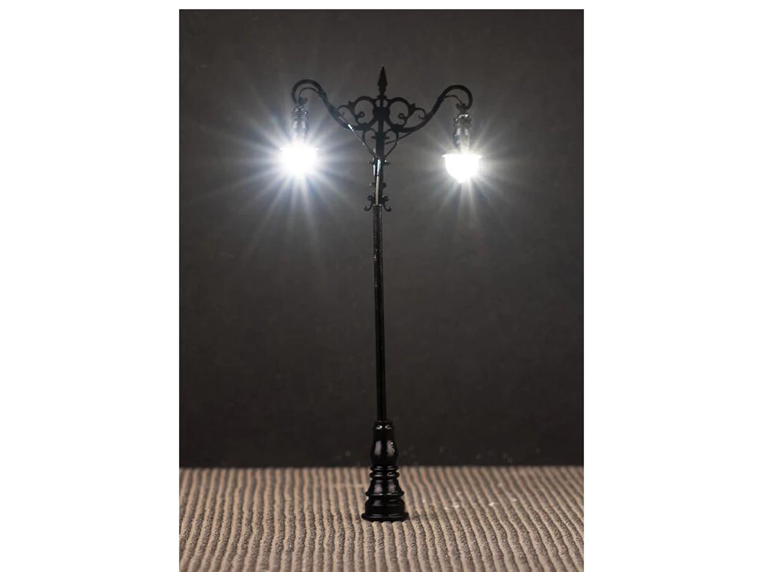 Modell: Spur H0. Modell einer historischen, schmiedeeisernen Kugel-Hängeleuchte. Die filigran ausgeführten Verzierungen verleihen dieser Laterne besonderen Charme. Damit eignet sie sich im besonderen Maße zur Beleuchtung von Altstädten, Parks und historischen Szenerien. Die zweiflammige Kugelleuchte ist mit langlebiger LED-Technik ausgestattet. Der Mast ist aus Metall gefertigt und die Leuchtenhöhe variabel einstellbar. Höhe: 75 mm. Lichtfarbe: kalt weiß Das Produkt ist anschlussfertig für 12 V Gleichspannung (DC). Nutzen Sie für den Betrieb der Leuchte den Transformator, Art. 180641.