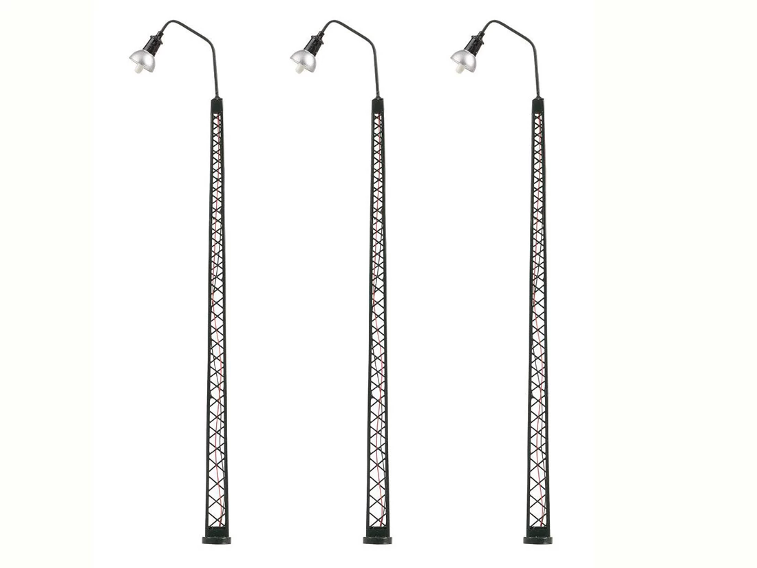Modell: Spur H0. 3er-Set einer Klassischen Bogenleuchte mit Gittermast aus Metall. Besonders geeignet zur Beleuchtung von bahnnahen Szenerien, wie Bahnhöfen, Betriebswerken oder Gleisfeldern. Die einflammige Leuchte ist mit langlebiger LED-Technik ausgestattet. Höhe: 145 mm. Lichtfarbe: warmweiß. Das Produkt ist anschlussfertig für 12 V Gleichspannung (DC).