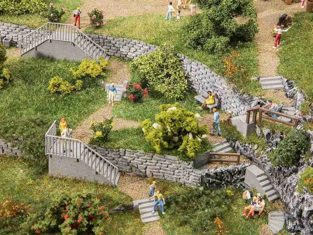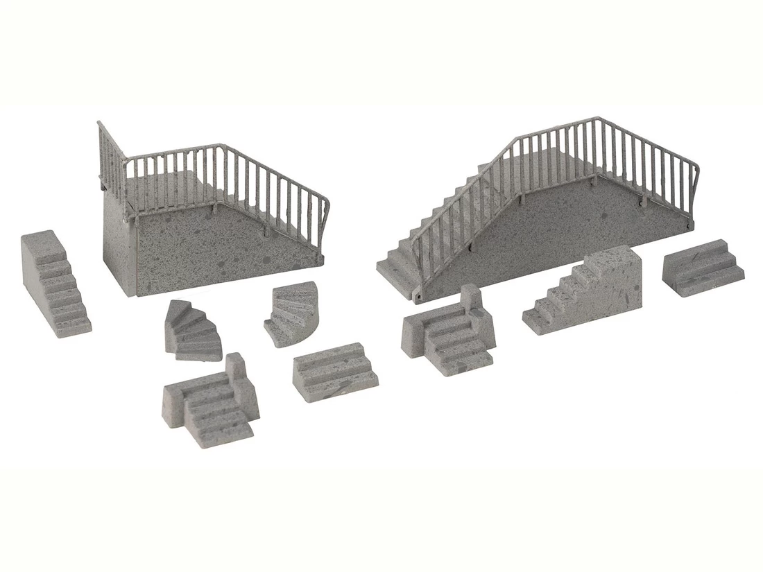 Modell: Spur H0. Ausstattungs-Set für den Außenbereich mit verschiedenen, geradläufigen und gewundenen Steintreppen-Elementen unterschiedlicher Form und Größe, zum Teil mit Geländern.