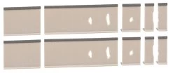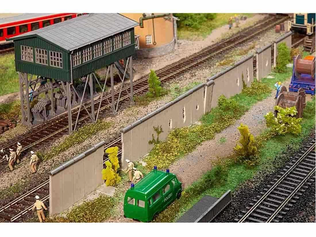 Modell: Spur H0. Betonelemente mit Sockel und einem runden, oberen Abschluss für den Bau einer hohen Mauer. Einzelne Elemente enthalten Mauerlöcher.