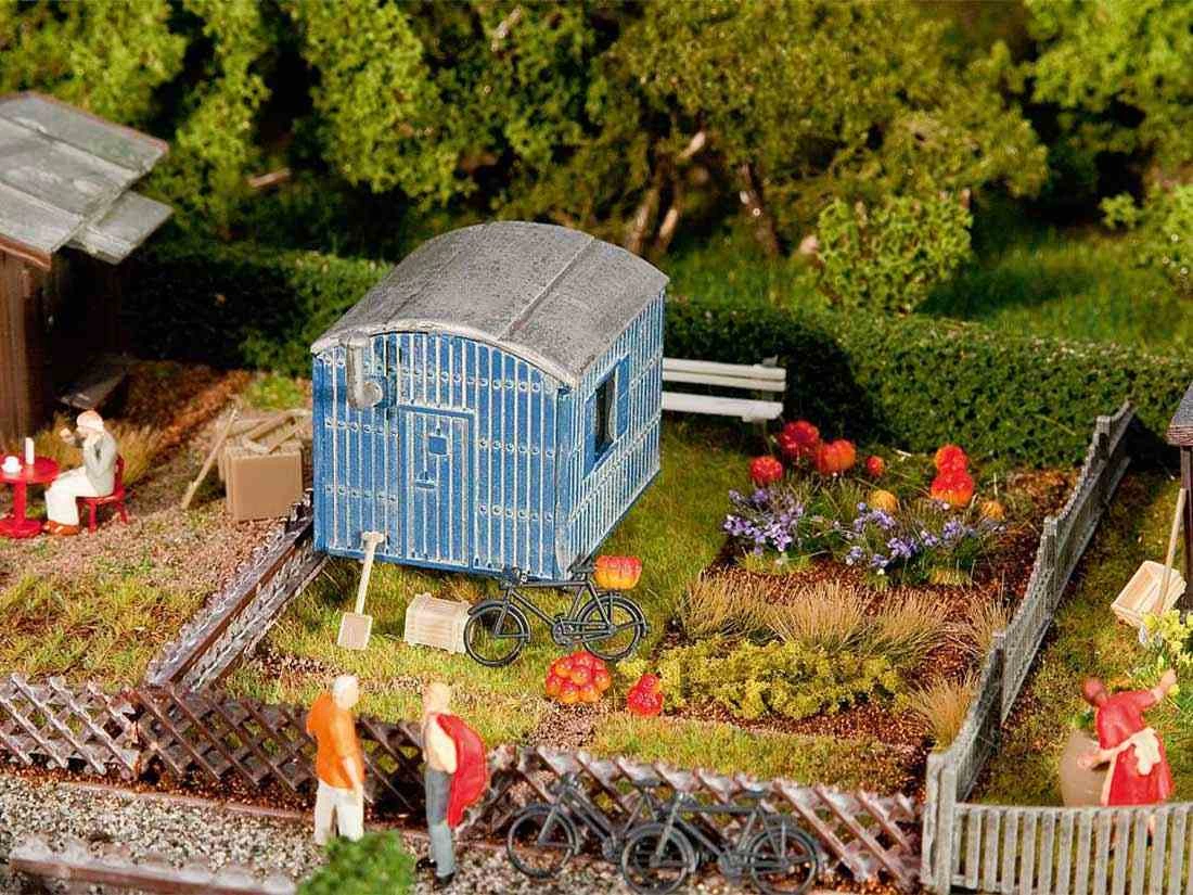 Modell: Spur H0. Charakteristischer Schrebergarten, der einzeln baubar ist und auch zu einer größeren Siedlung erweitert werden kann. Sehr häufig in Bahn- oder Flußnähe anzutreffen. Das Set wird ergänzt durch ein schönes Landschaftssegment und typisches Zubehör.