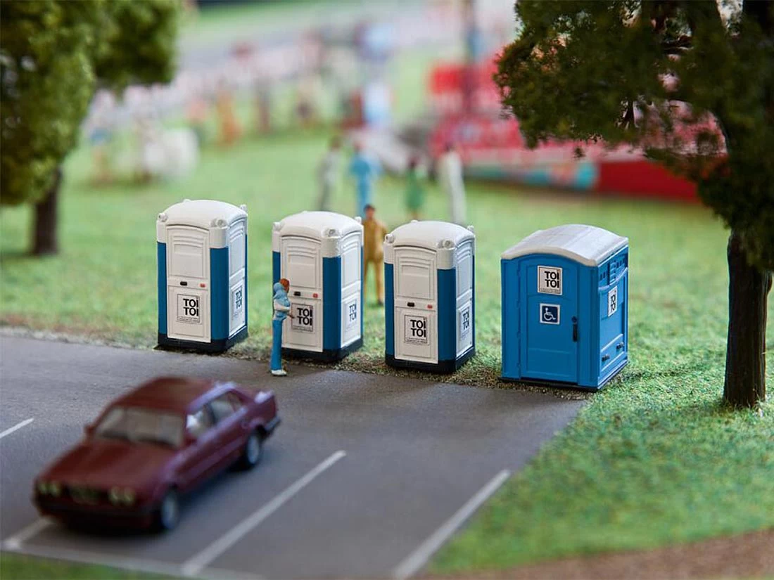 Modell: Spur H0. 3 Standard-Kabinen und 1 Toilettenkabine für Rollstuhlfahrer. Ideal einsetzbar auf Baustellen oder bei Veranstaltungen und Kirmes.