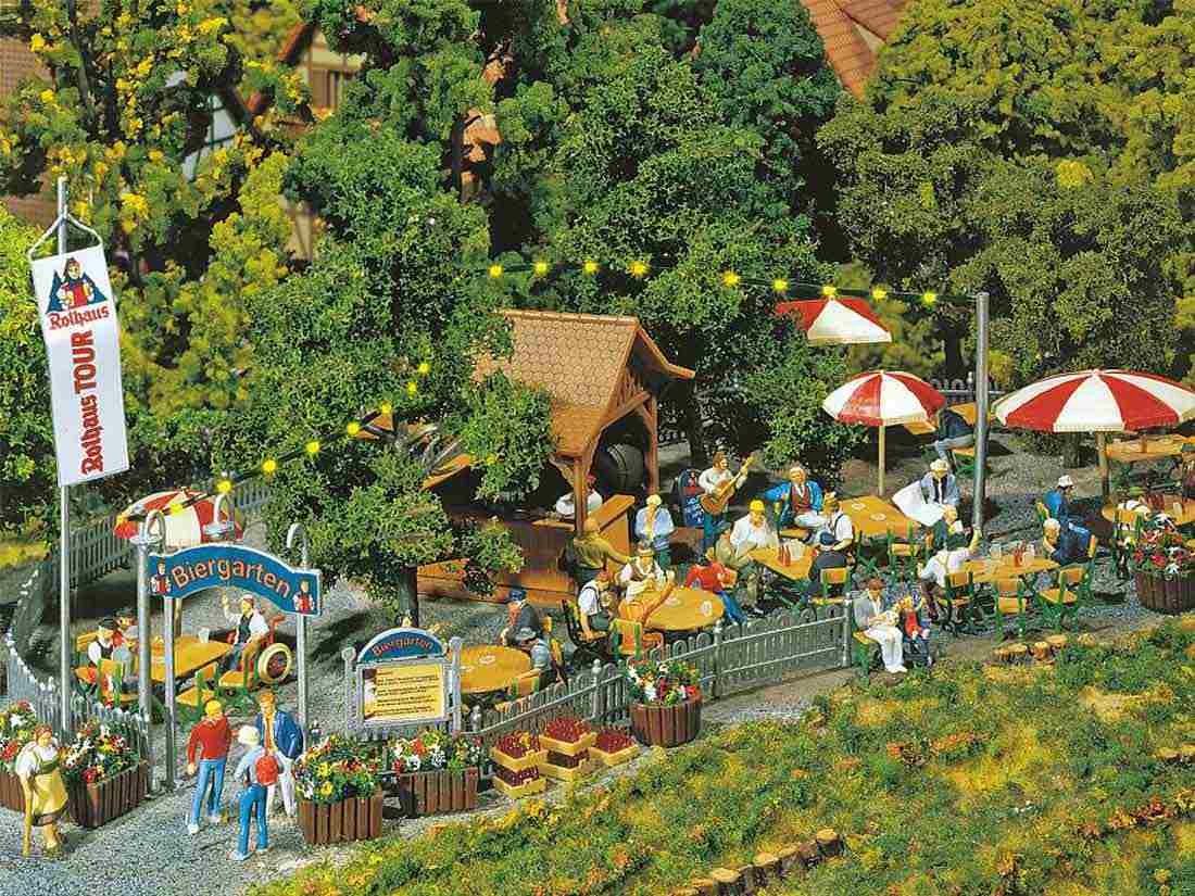 Modell: Spur H0. Biergarten wie man ihn sich wünscht: mit Tischen, Stühlen, Eingangsschild, Sonnenschirmen, Ausschanktheke, beleuchteter Lichterkette (180 mm) und diversen Zubehörteilen. Variabel baubar.