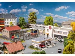 Modell: Spur H0. Service rund um’s Auto! 4-teiliges Themen-Set mit Kleinbetrieben in einem Gewerbegebiet. Vom Autohaus mit großem Schaufenster, über einen Waschplatz mit zwei SB-Autowaschboxen, bis hin zur zweiständigen Kfz-Werkstatt mit Büroräumen und einem umzäunten Schrotthandel bereichern zahlreiche Fachbetriebe den kleinen Gewerbepark.