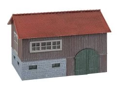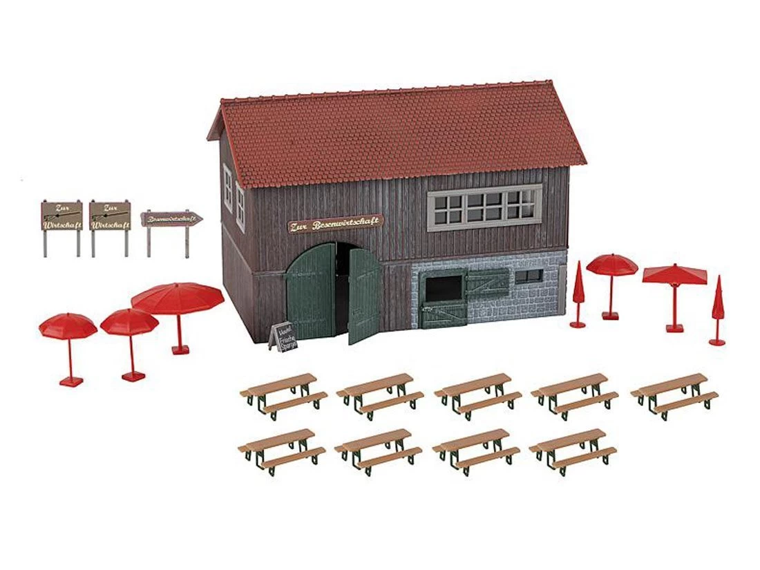 Modell: Spur H0. Urige Besenwirtschaft in einer ehemaligen, zum Teil gemauerten Holzscheune mit großen Toren und Fenstern. Zahlreiche Ausgestaltungselemente, wie Biertischgarnituren, Sonnenschirme und Werbetafeln liegen dem Modell bei.