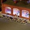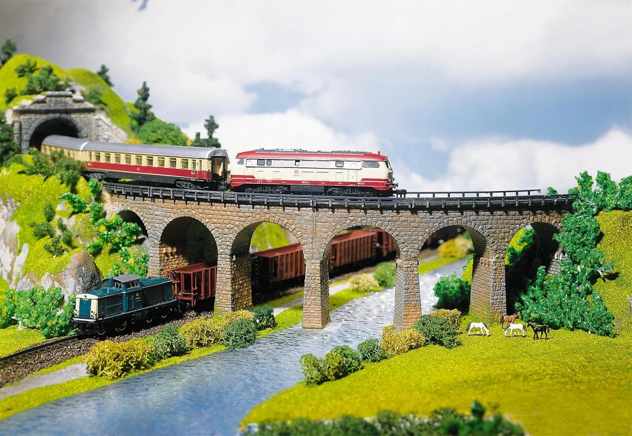2 Brückenteile mit Gleisbetten, je 45° (auf 30° verkürzbar), mittlerer Radius 193 mm. 6 Pfeiler à 38 mm. Durchfahrtshöhe mit Pfeilern 57 mm. Brückenteile auch einzeln verwendbar. Halterungen für Oberleitungsmasten liegen bei.
