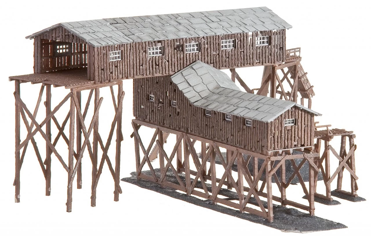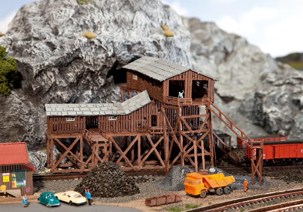 Modell einer Kohlemine in Holzbauweise mit diversen Be- und Entlademöglichkeiten.