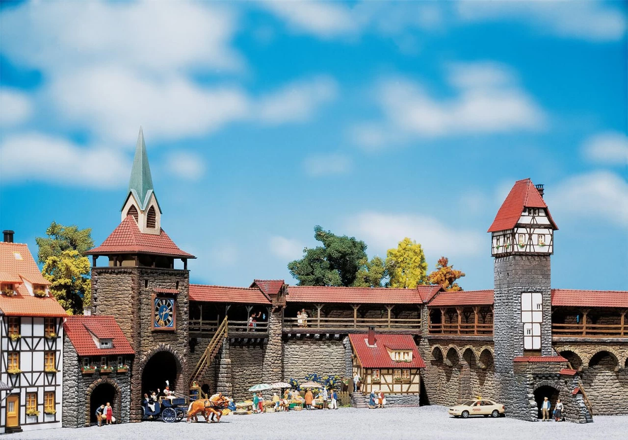 Sammelpackung zum Thema »Altstadtmauer«. Das Set enthält die Elemente: • Altstadtmauer mit angebautem Fachwerkhaus • Altstadtmauer mit Treppenaufgang • Altstadtmauerteil mit Wehrgang • 2 Altstadt-Wehrtürme • Altstadt-Stadttor mit angebautem Haus, beide Gebäude mit Durchfahrtsmöglichkeit.