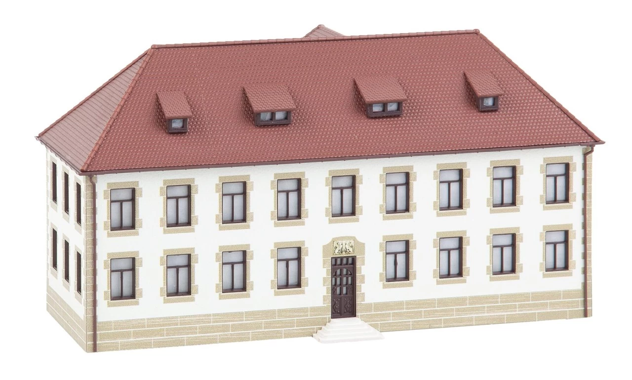 Zweistöckiges Verwaltungsgebäude mit Walmdach, Dachgauben und einem Treppenhaus-Anbau. Haussockel, Eckquader und Fenstereinfassungen sind im Digitaldruck aufgebracht.