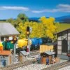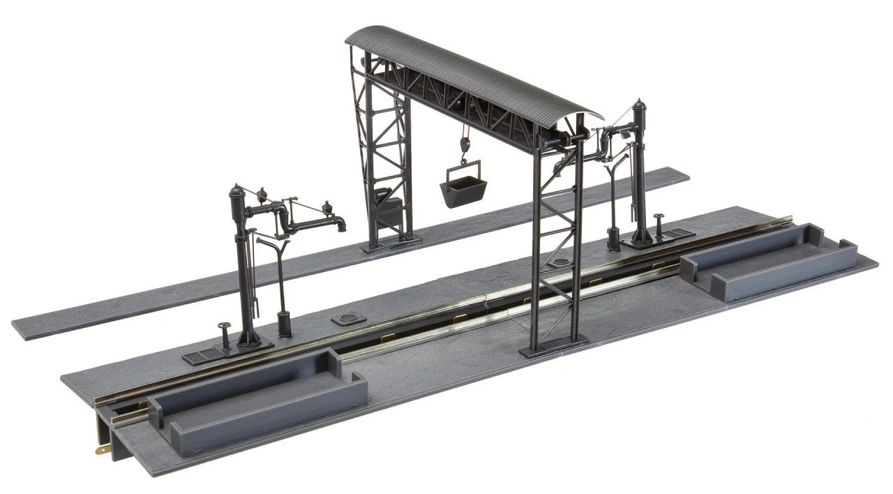 Dieses Modell-Set besteht aus Bockkran, 2 beheizten Gelenk-Wasserkränen (DB NW 200), 2 Löschebansen, der Bodenplatte (344 mm) mit Schlackegrube und außerdem einem Schlackekarren mit Rollgestell und einem Schlackekübel. Die Bodenplatte ist über der Schlackegrube mit zwei Fahrschienen ausgerüstet. Sie kann an alle Gleisarten angeschlossen werden, auch an Mittelleiter-Gleise, außer Märklin C-Gleis. Die Kombination mit zwei Untersuchungsgruben (120136) ergibt eine 2-gleisige Ausschlackanlage mit Parallelgleisabstand 67 mm, abgestimmt auf den Gleisabstand des Hochbunkers (120148). Bei dieser Aufstellung kann der Bockkran 3 Gleise überbrückend gebaut werden – 2 Schlackegruben und Schlackewagen-Gleis.