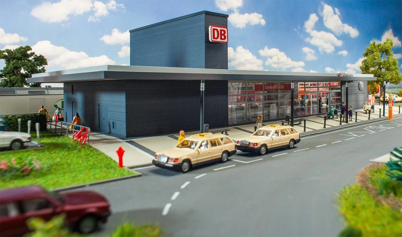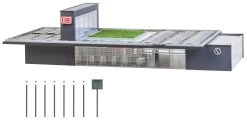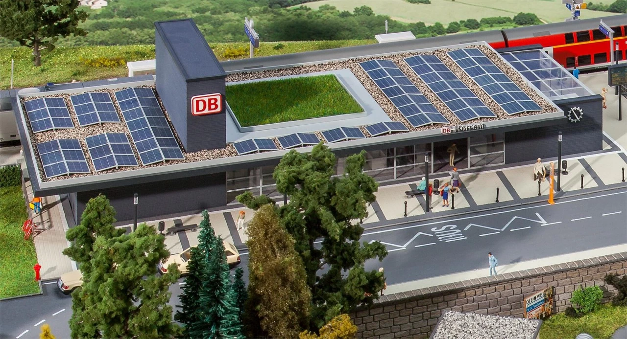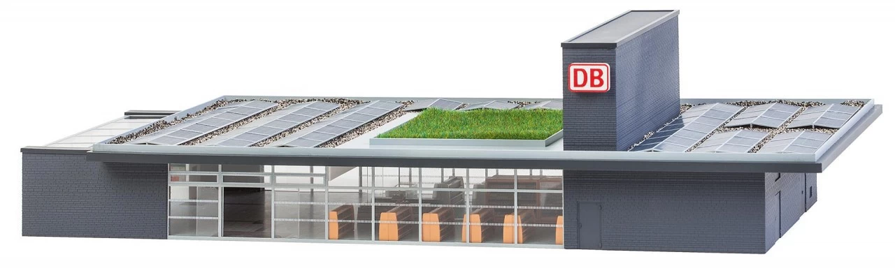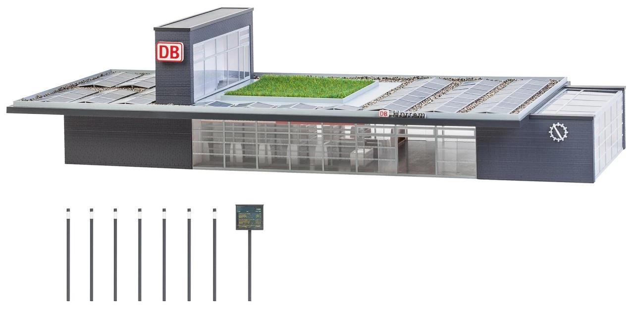 Neue Standards für das Empfangsgebäude Ihrer Bahn! Originalgetreues Modell nach dem Vorbild des »Grünen Bahnhofs« in Kerpen-Horrem in Nordrhein-Westfalen an der Regionalexpress-Strecke zwischen Köln und Aachen. Das Leuchtturmprojekt der DB Station&Service AG ist die erste ganzheitlich unter Umwelt-, Energie- und Klimaaspekten gebaute Station. Während die klare Gliederung und zurückhaltende Farbgebung des Schieferbaus den Zügen den großen Auftritt überlässt, sorgen großflächig verglaste Fassaden- und Dachflächen für Transparenz und optimalen Tageslichteintrag für die Reisenden in der zentralen, stützenfreien Halle mit Wartebereich. Photovoltaik für die Nutzung von Sonnenenergie sowie die Begrünung der unterschiedlich lang auskragenden Dachflächen runden das ökologische Erfolgsmodell ab. Sitzelemente, moderne Laternen und Zuganzeiger liegen dem Bausatz bei.