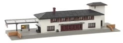 Zeitlos! Bahnhof-Set in Anlehnung an den FALLER Klassiker »Schönblick«, bestehend aus einem Stadtbahnhof mit Glas-Bahnsteigdach, einem Stellwerk mit Holzanbau und einem Güterschuppen mit Schiebetoren, Vordach und einer Holzverkleidung im Obergeschoss. Bahnsteig- und Bodenplatten für alle Modelle beiliegend.