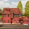Umfassend! Mehrteiliges Set bestehend aus einem Landbahnhof mit angebautem Güterschuppen, einem Bahnsteig sowie dem passenden beschrankten Bahnübergang mit Zubehör für die sichere Überquerung der Gleise.