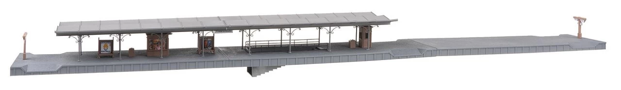 Überdachter Bahnsteig in filigraner Gusseisenkonstruktion mit Personenabgang. Zahlreiches Ausschmückungszubehör, wie z.B. Kiosk, Aufsichtsbude, Zugzielanzeiger, Sitzbänke und Abfallkörbe liegen dem Bausatz bei. Der Bahnsteig passt ideal zum Bahnhof »Friedrichstadt«, Art. 190297.