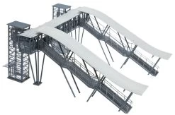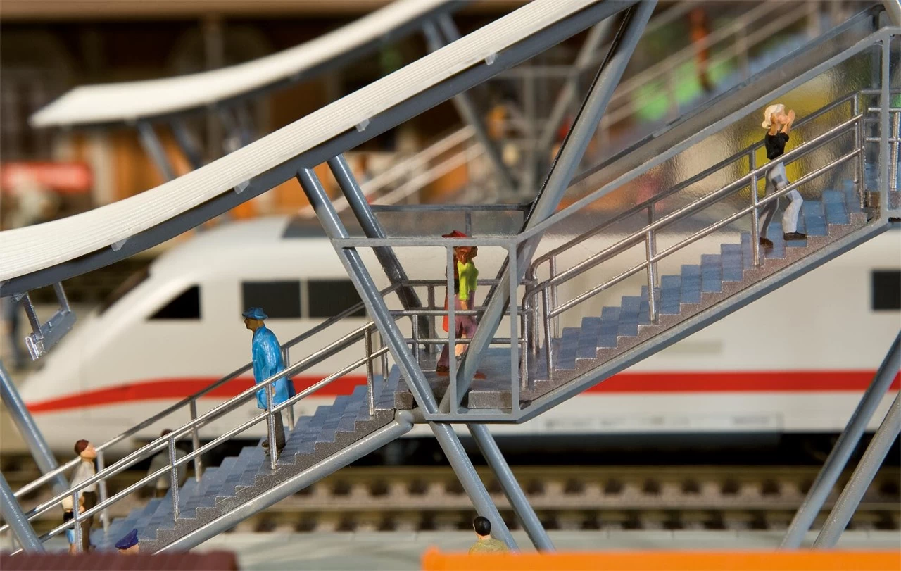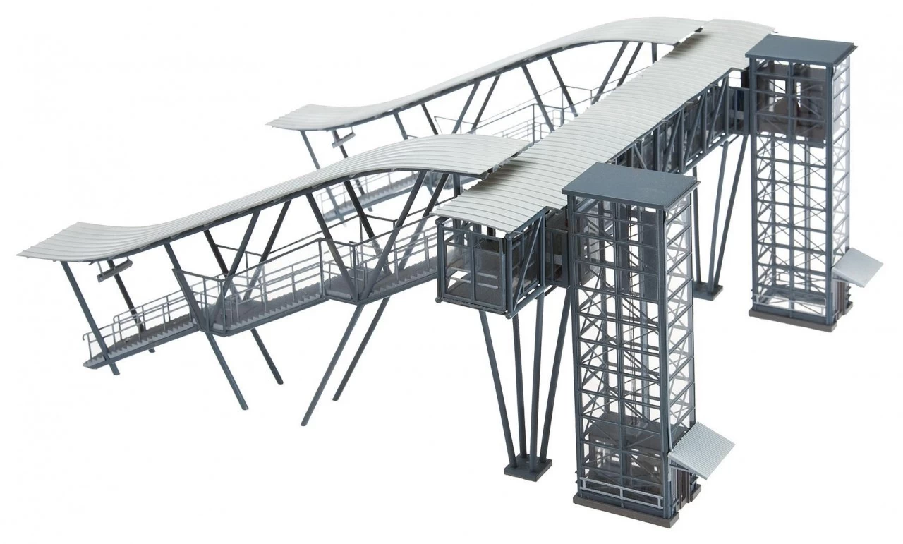 Originalnachbau der Bahnsteigbrücke in Neustadt, passend zum FALLER Bahnhof »Neustadt/Weinstraße« (Art. 110111). Moderne Glas-/Stahlkonstruktion, mit zwei überdachten Treppen-Auf-/Abgängen, 2 Gleise überspannendem Brückenteil und 2 angebauten Aufzugstürmen (ohne Funktion). Die Auf-/Abgänge können in der Breite variabel im Raster an das Brückenteil angebaut werden, so dass alle Gleisarten verwendet werden können. Mehrfach nebeneinander baubar. Oberleitungsbetrieb ist möglich. Ohne Bahnsteigplatten. Mit allen FALLER Bahnsteigen kombinierbar.