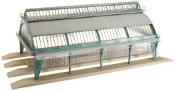 Filigrane, großräumige Bahnsteighalle. Durchfahrtsbreite für 3-gleisigen Verkehr mit C-Gleis und allen anderen Gleisarten geeignet. Oberleitungsbetrieb möglich. Mehrfach hinter- und nebeneinander baubar. Beleuchtbar mit 6 x Art. 180671.