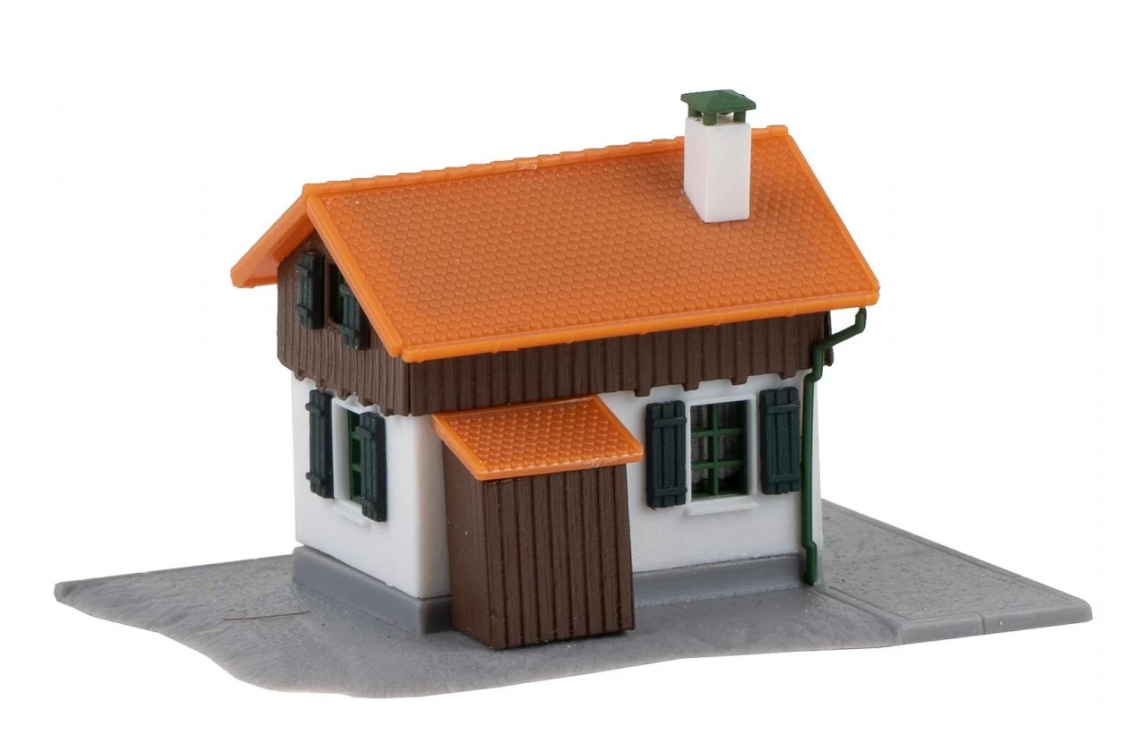 An der Bahnlinie! Ländliches Bahnwärterhäuschen mit umlaufendem Steinsockel, Putzfassade und einer Bretterverschalung im Obergeschoss. Seitlich ist ein kleiner Schuppen angebaut. Eine Bodenplatte liegt dem Bausatz bei.