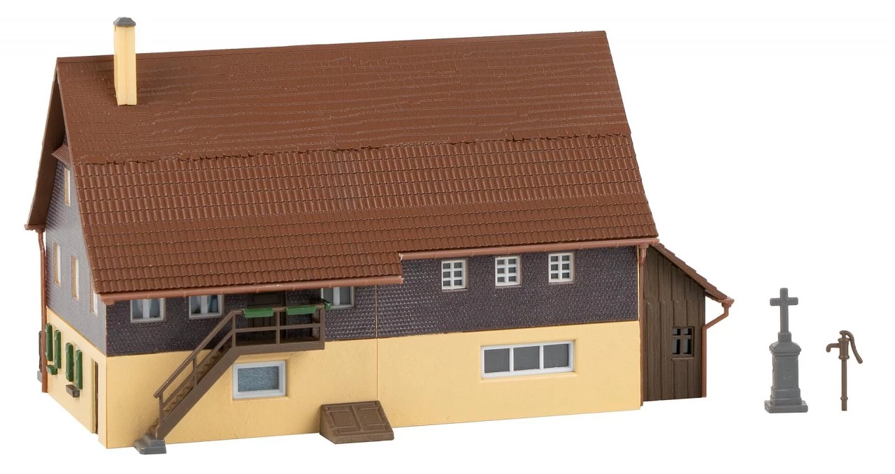 Zweistöckiges Bauernhaus mit Wohn-, Stall- und Scheunenbereich, unterschiedlich gestalteten Fassaden und einem seitlichen Bretteranbau. Als Ausgestaltungselemente liegen dem Bausatz eine Kellerfalle, ein Wegkreuz, eine Güllepumpe und Blumenkästen bei.