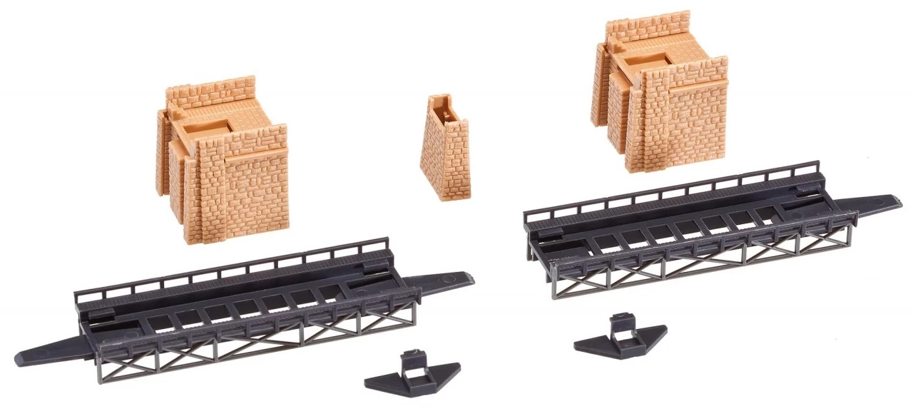 2 Basispfeiler, 1 Mittelstütze, 2 gerade Gleisbetten, je 100 mm, zum Bau einer Brücke. Die Basispfeiler von Art. 222550 können auch als Auflage für die Brücke Art. 222581, 222583, 222585, 222586 verwendet werden.