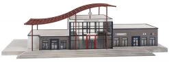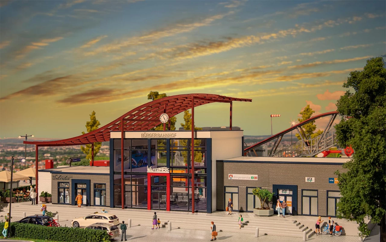 »Futuristisch, glasklar, farbenfroh!« Moderner Mehrzweckbahnhof mit geschwungenem Dach nach dem 2018 errichteten Originalvorbild im Sauerländischen Wintersportort Winterberg. Die Dachkonstruktion ist der lokalen Skisprungschanze nachempfunden und überspannt mehrere Module des Gebäudeensembles. Neben der raumhoch verglasten Bahnhofshalle mit DB-Verkaufsschalter, Kiosk und Toiletten befinden sich in dem Gebäude ein Bürgerservice-Büro mit Touristik-Servicepoint, Räume der Volkshochschule und des Gesundheits- und Kreisjugendamtes sowie ein Restaurant. Für dieses »Bürgerbahnhof«-Konzept mit breiter Angebotspalette an Dienstleistungen erhielt das Bahnhofsgebäude 2018 vom Verein »Allianz pro Schiene« die Auszeichnung »Bahnhof des Jahres« als kundenfreundlichster Bahnhof.