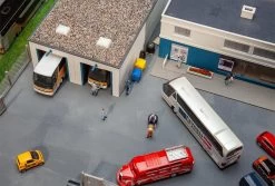 Gebäude-Set bestehend aus einem zweistöckigen Bürogebäude mit Eckverglasung und Innenmöblierung sowie einer Fahrzeughalle mit zwei Busstellplätzen und je zwei verglasten Falttoren an den Stirnseiten. Durch die Durchfahrtsmöglichkeit geeignet für Car System und Car System Digital.