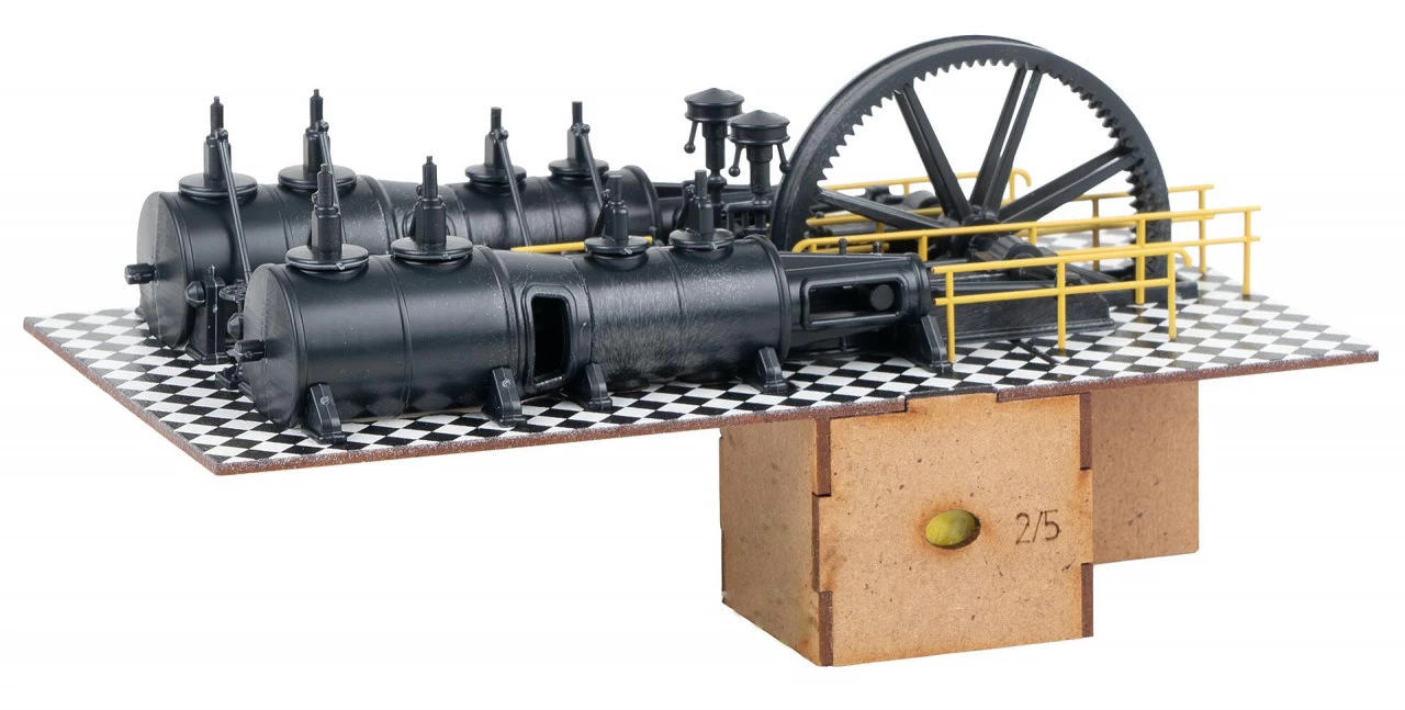 Maschinenausstattung für Industriemodelle. Liegende Dreifachexpansionsmaschine in Tandembauart. Das Seilschwungrad kann mit dem FALLER Synchron-Bastelmotor, Art. 180629 (nicht beiliegend) betrieben werden.