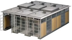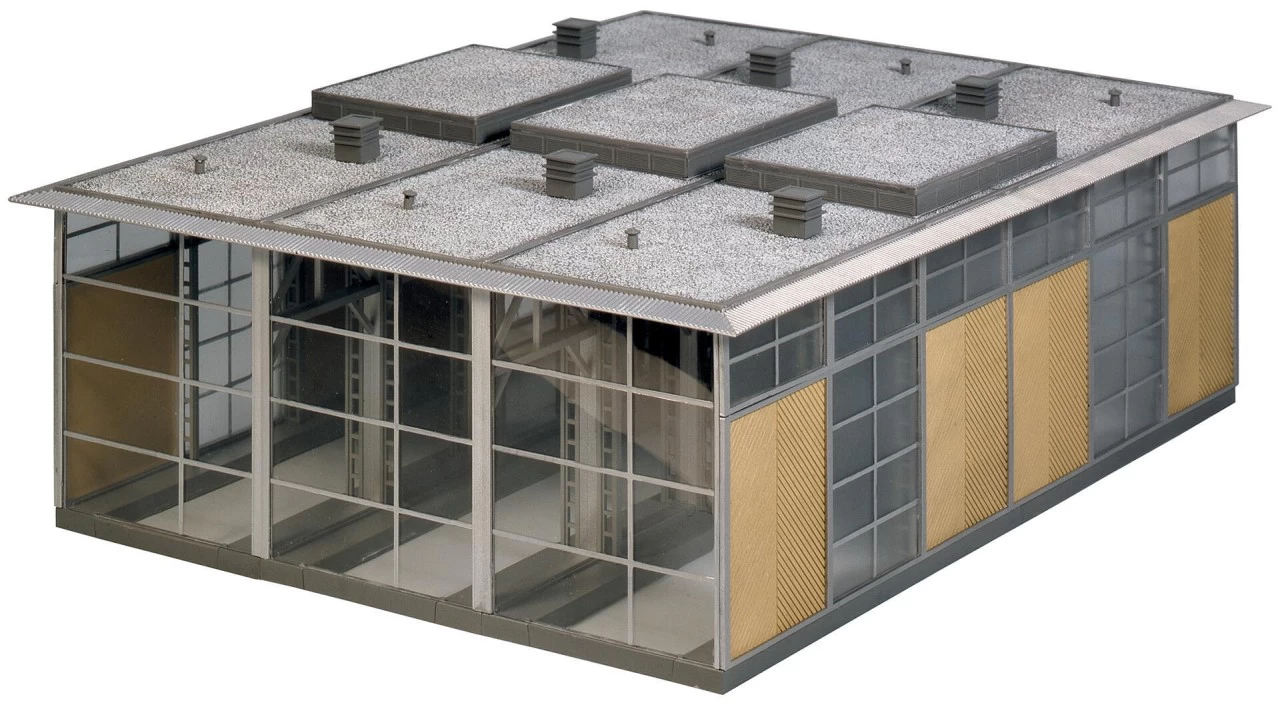 In offener, transparenter Glasbauweise, mit 3 Unterständen für Loks bis 310 mm LüP. Die Tore können durch Einbau je eines Torantriebs (Art. 180624, 12-16 V, Gleich-/Wechselspannung) langsam geöffnet und geschlossen werden. Mechanische Teile liegen bei. Für Schiebebühneneinsatz und für alle Gleisarten verwendbar. Oberleitungsbetrieb möglich. Mehrfach nebeneinander baubar.