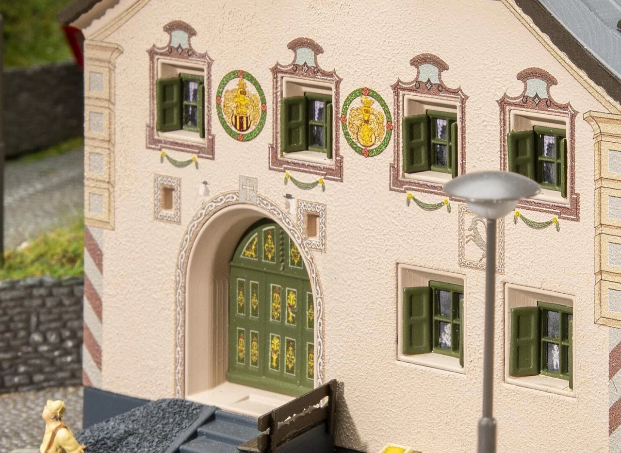 So Swiss! Baukultur im Unterengadin. Bauernhaus-Modell eines Engadinerhauses mit Vieh- und Heustall aus der Hausgeneration vor 1800 mit geschweiftem Giebel, Wandmalereien, tiefen Fensterfluchten und einem Rundbogentor nach dem Originalvorbild der »Chasa Tschalär«, vormals Sitz eines bischöflichen Meiers im Schweizerischen Dorf »Sent«. Digital bedrucktes Modell.