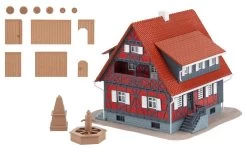 1-stöckiges Wohnhaus in Fachwerkbauweise mit grauen Balken und roter Ausfachung. Zwei Dachloggien, zwei große Gauben und die überdachte Veranda schmücken das kleine Gebäude mit Steinsockel, dessen Eingang über eine Außentreppe erreicht wird. Für die Szenenausgestaltung liegen ein Brunnen, ein kleiner Obelisk und Blumentröge bei.
