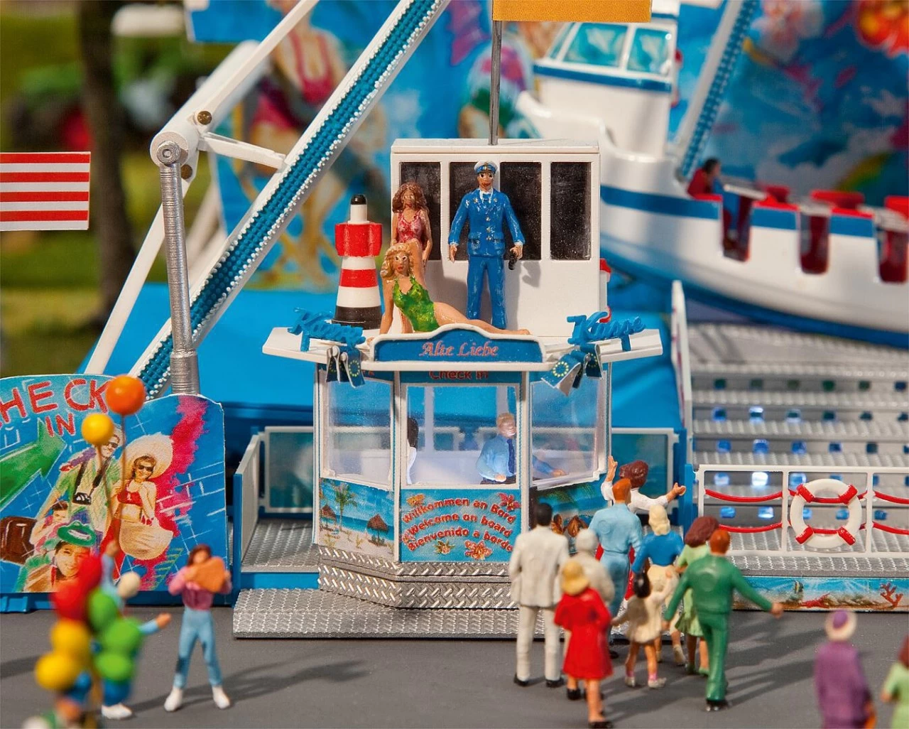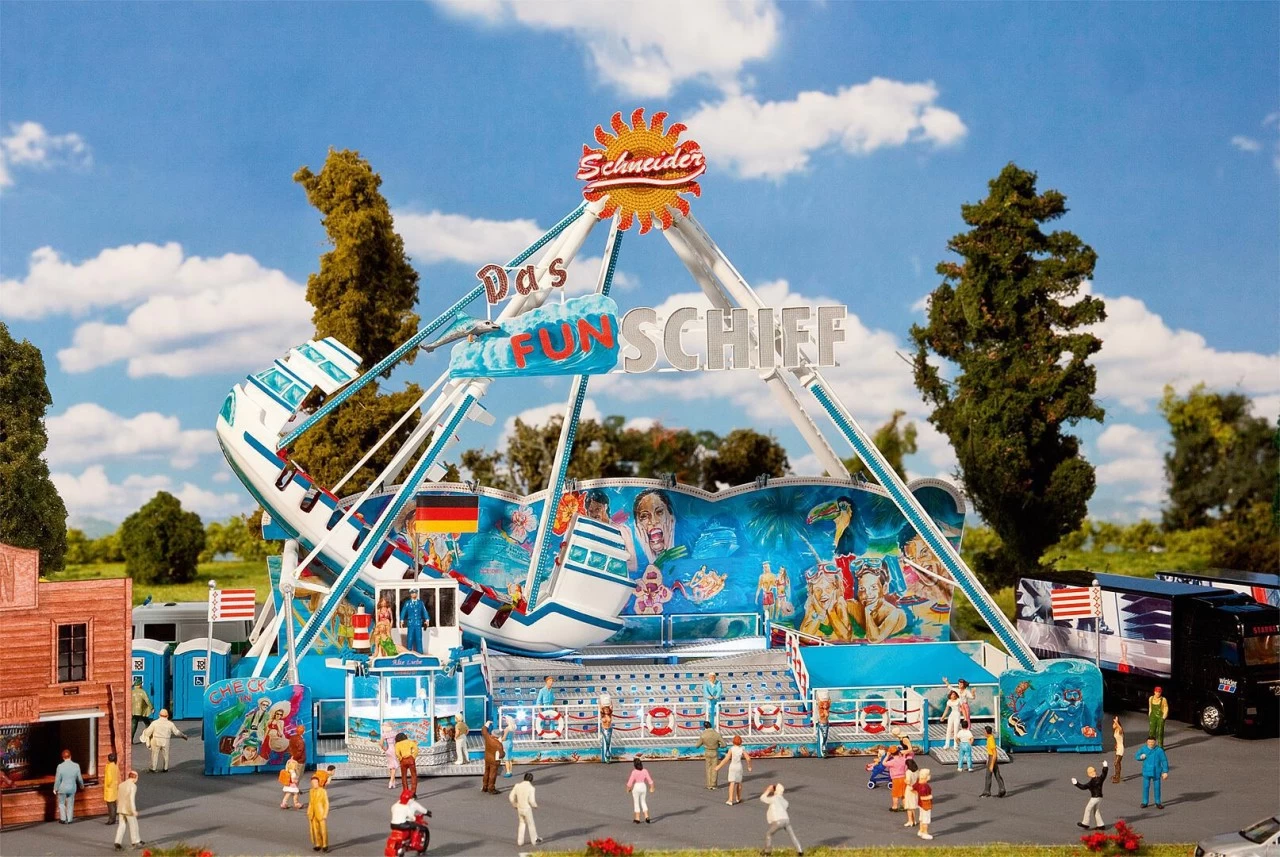 Europas größter Schaukelspaß. Willkommen an Bord des ersten serienhergestellten Kirmesmodells einer großen Schiffschaukel. Der beleuchtete Schaukelspaß mit komplettem Antrieb (Motor & Steuerung) schwingt weit in die Höhe, während seine Dekoration Urlaubsgefühle vom Meer weckt. Der Antrieb erfolgt über einen sehr leisen und leistungsstarken Gleichstrommotor mit Metallgetriebe. Die Steuerung kann über Taster oder eine Digitalzentrale aktiviert werden. Danach läuft ein der Realität entsprechendes Programm vollautomatisch ab. Der Anschluss erfolgt über 16 V Wechselspannung. Einsteigen, Spaß haben und die Aussicht genießen. Das Original »FUN-Schiff« ist im Besitz der Firma Schneider.