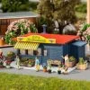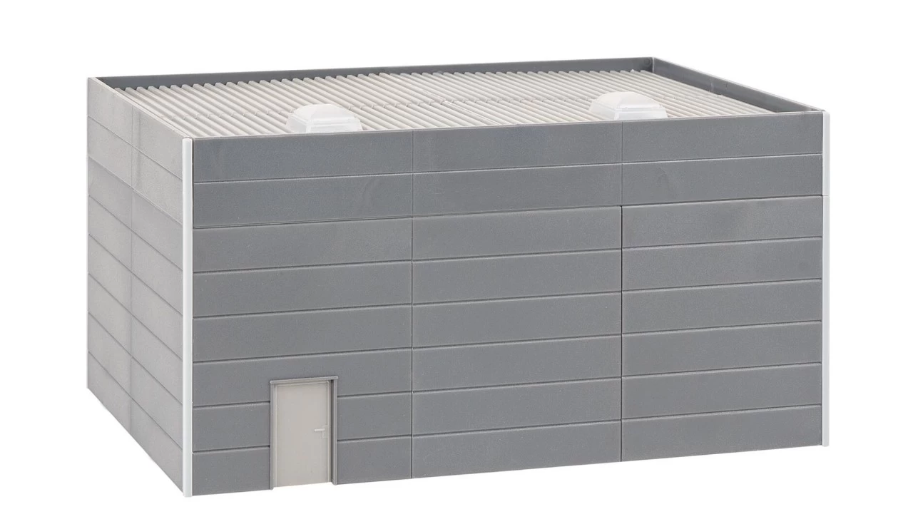 Bauen mit System. Zweiständiger, offener Fahrzeugunterstand mit zwei Oberlichtern und rückwärtiger Tür. Kompatibel und erweiterbar mit Systemelementen der FALLER Goldbeck-Serie.