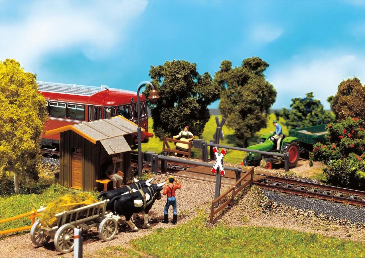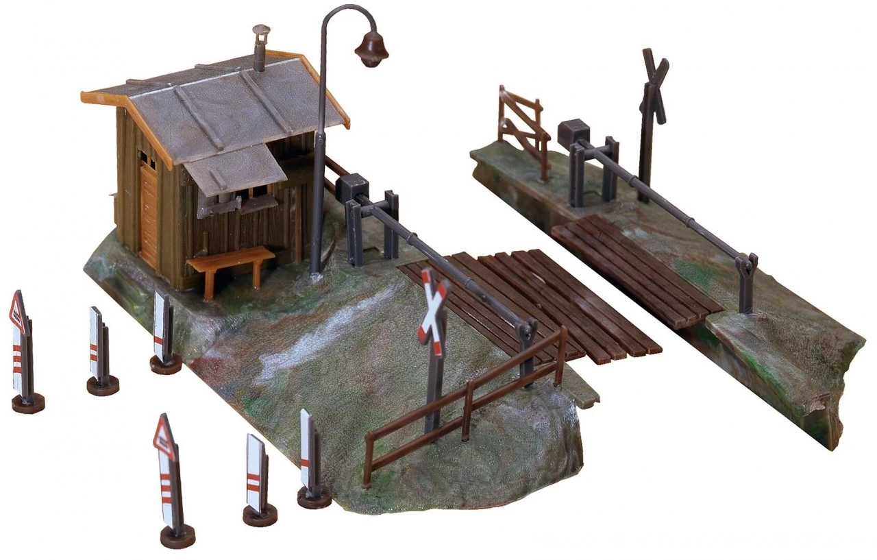 Feldwegübergang mit Schrankenwärterhaus und beweglichen Schlagbäumen. Für alle geraden oder gebogenen Modellgleise.