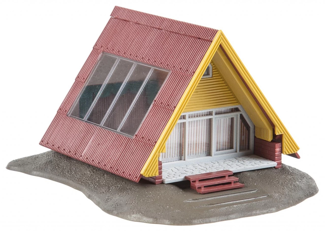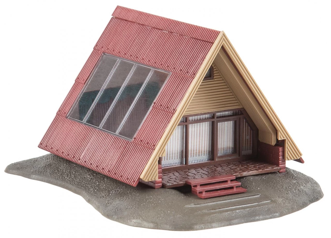Feriensiedlung bestehend aus drei zeltförmigen Nurdachhäusern unterschiedlicher Farbgebung, jeweils mit großem Dachfenstern und Bodenplatten mit Stufen zu den kleinen Terrassen. Als passende Ergänzung empfohlenes Zubehör: »Gebäude-Inneneinrichtung«, Art. 180545 und »Büroeinrichtung«, Art. 180454.