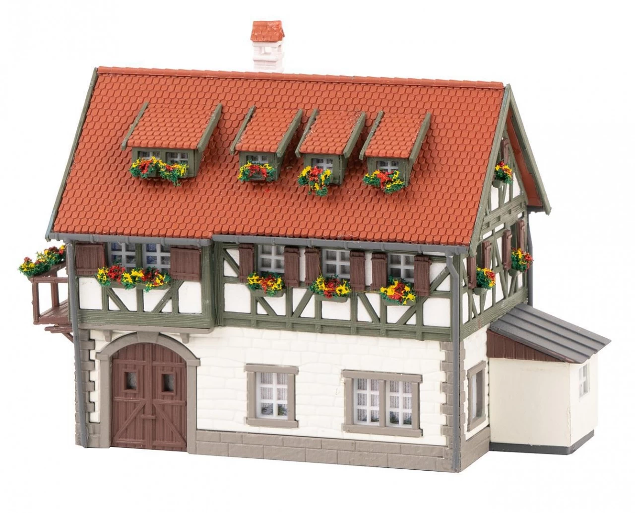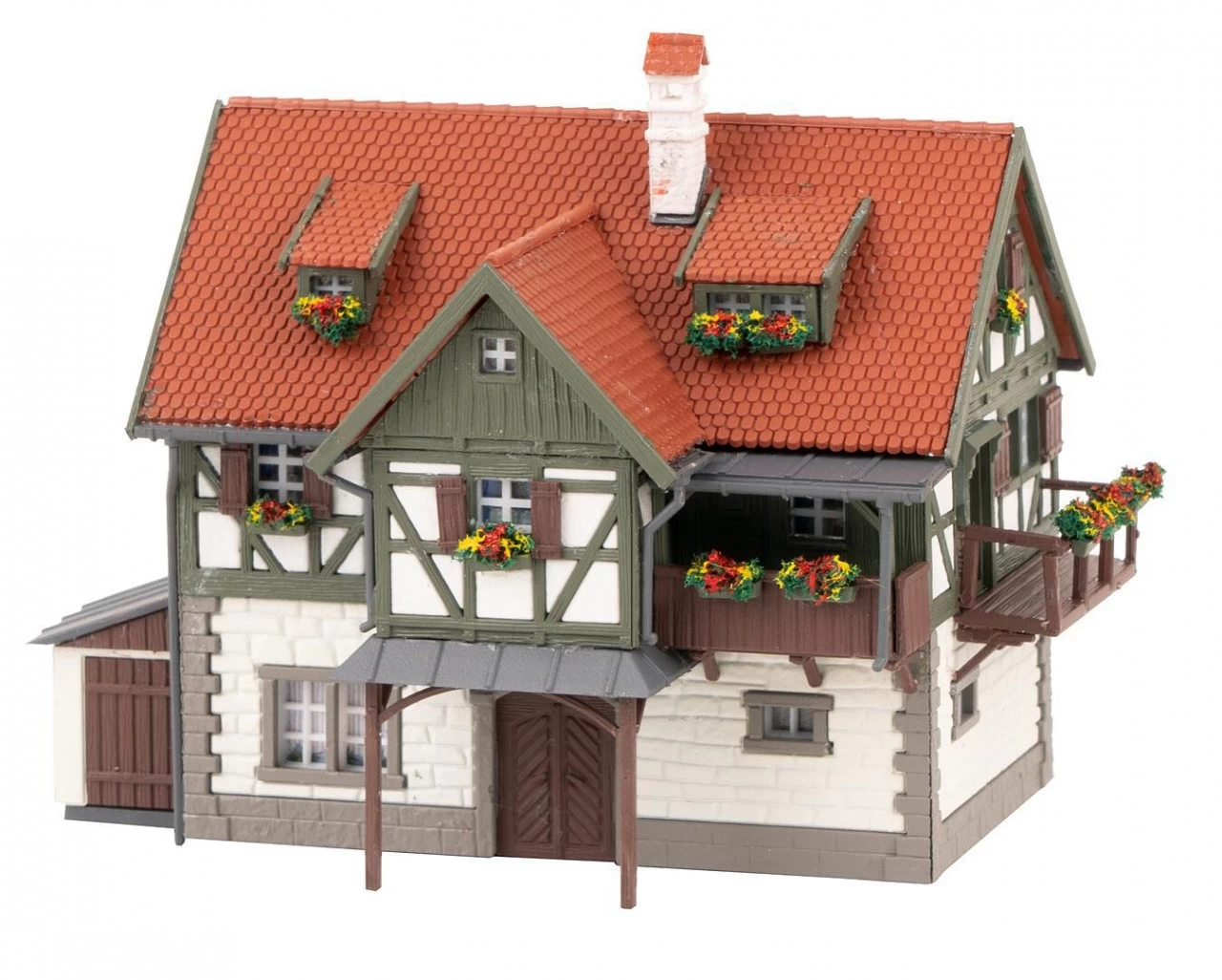 LĂ€ndliches, zweigeschossiges ForstamtsgebĂ€ude mit Fachwerkobergeschoss, Dachgauben und drittem Giebel. Zur vielseitigen Gestaltung des Modells tragen ein Schuppenanbau, ein Holzbalkon, eine HundehĂŒtte und BlumenkĂ€sten bei.