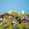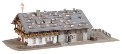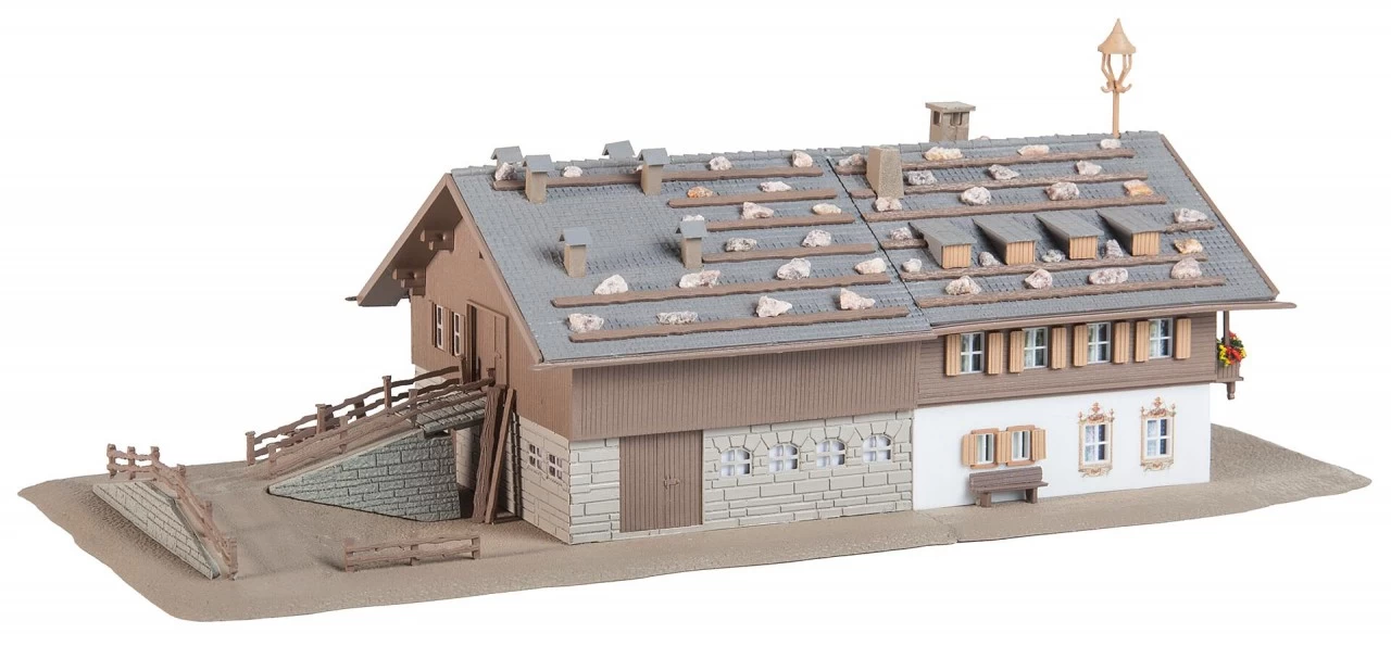 Auf in die Berge. Alpenländischer Einhof mit Wohn- und Scheunenbereich, teilverputztem Erdgeschoss sowie Holzfassaden im Obergeschoss und in den Giebeln. Zier- und Pfettenbretter schmücken die Stirnseite mit den rustikalen Holzbalkonen. Die zweite Scheunenebene wird über eine große, gemauerte Hochfahrt befahren. Die Dachschindeln sind mit Steinen vor Windabwurf gesichert, florale Lüftlmalerei rahmt die Fenster und rund um das Haus laden Bänke zum Verweilen ein.