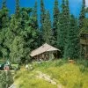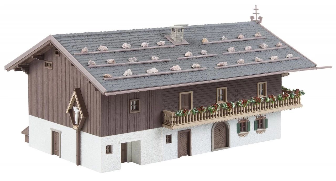 2-stöckiges Wohnhaus im alpenländischen Baustil mit einem gemauerten, verputzten und mit im Digitaldruck aufgebrachter Lüftlmalerei verzierten Erdgeschoss sowie einem aus Balken gezimmerten Obergeschoss mit angebrachtem Hausspruch. Das Schindeldach mit Giebelschmuck ist mit Steinen beschwert. Kreuz Christi, Hundehütte und WC-Häuschen liegen dem Bausatz zur Ausschmückung bei.