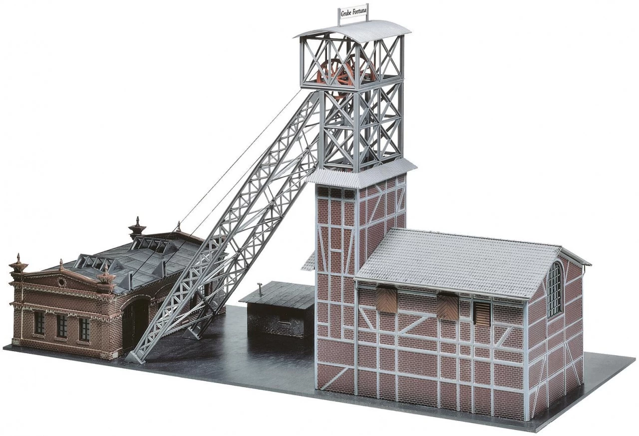 Eine Kohleförderanlage mit Schachthalle und doppeltem Förderturm mit zwei SeilÂscheiben, die durch Zukauf des FALLER-Motors (Art. 180629, 12-16 V, Wechselspannung) angetrieben werden können. Motor liegt nicht bei. Das Fördermaschinenhaus mit Geräteschuppen und angebautem Ă–llager ist ebenfalls enthalten.