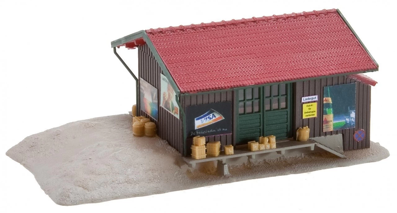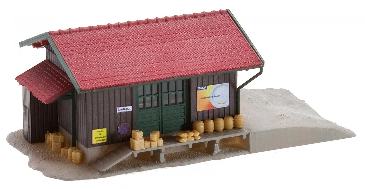 Güterschuppen in Holzbauweise, mit Verladerampe und seitlicher Auffahrtsschräge.