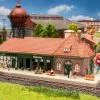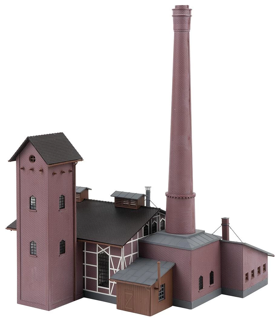Warmwasser-Heizwerk mit Turmanbau, hohem Schornstein, Büroanbau, Holzschuppen und einer Torzufahrt ins Kesselhaus für den Antransport des Brennstoffs.