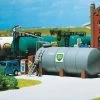 Bauen mit System. Im Aufbau befindliche Produktions-, Speditions- oder Lagerhalle. Zwei Wände mit Tor- und Fensteraussparungen, die Stützen und das Tragwerk sind bereits errichtet. Bodenplatte beiliegend. Kompatibel und erweiterbar mit Systemelementen der FALLER Goldbeck-Serie.