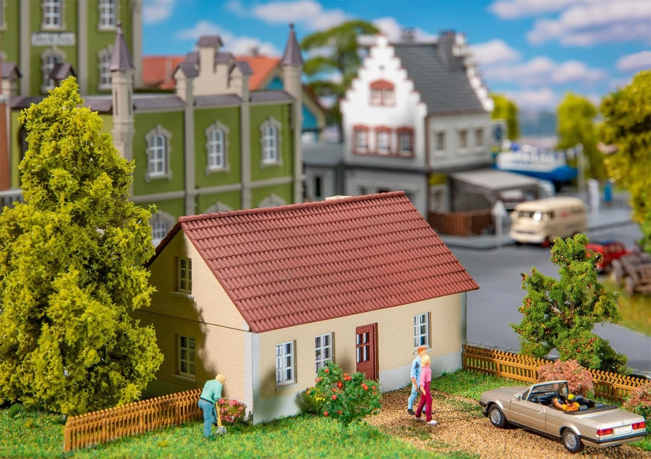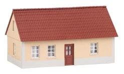 Ideal fĂŒr ModellbauanfĂ€nger. Hell verputztes, einstöckiges Wohnhaus mit Ziegeldach und einem Schornstein. GebĂ€udesockel und -kanten sind farblich abgesetzt.