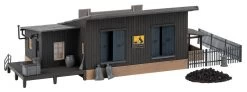 Großer Kohleschuppen in Holzbauweise mit beweglichen Toren zur Bahnseite und einem Pultdach. An den Stirnseiten wird das Lagergebäude flankiert von einem überdachten Außenlager und einem Büroanbau, der über eine kleine Terrasse betreten wird. Für die Szenengestaltung liegen ein Zaun, Schub- und Sackkarren, Fässer, Säcke und Kohle bei.