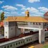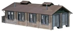 Lokschuppen in Ziegelbauweise, mit 2 Unterständen für Loks bis zu 270 mm LÜP. Die Tore verfügen über Federn, die diese nach dem Durchfahren einer Lok automatisch wieder schließen. Oberleitungsbetrieb möglich.