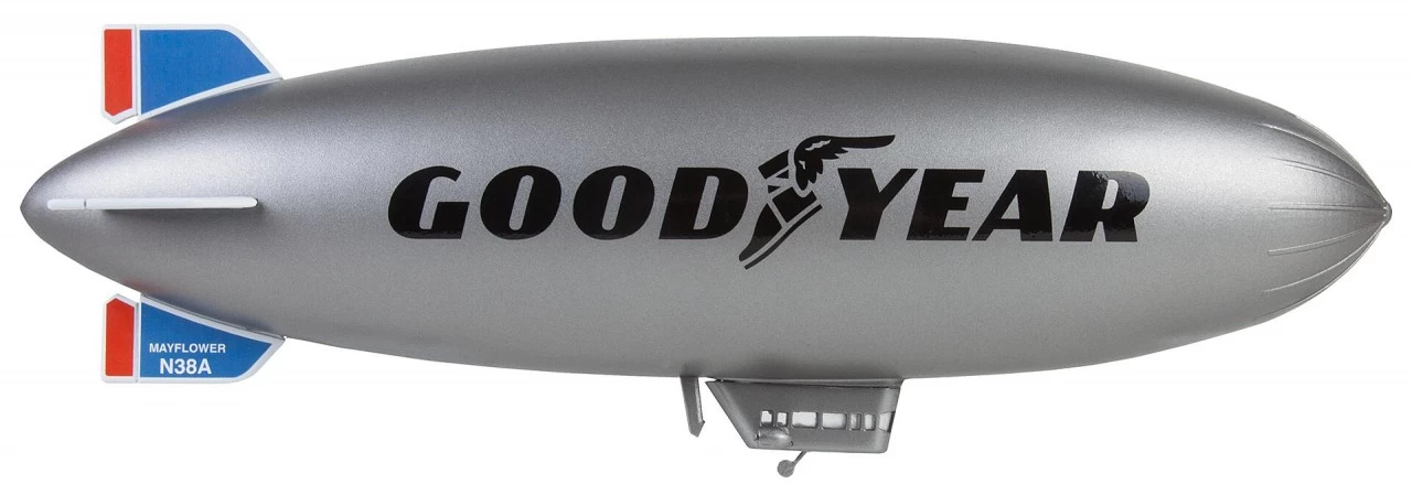 GlĂŒck ab! Modell eines Blimps des Typs »GZ-20a« aus der legendĂ€ren Goodyear-Flotte mit grauer Gondel und einer grauen HĂŒlle mit »Goodyear«-Schriftzug sowie blauen Stabilisierungsflossen.