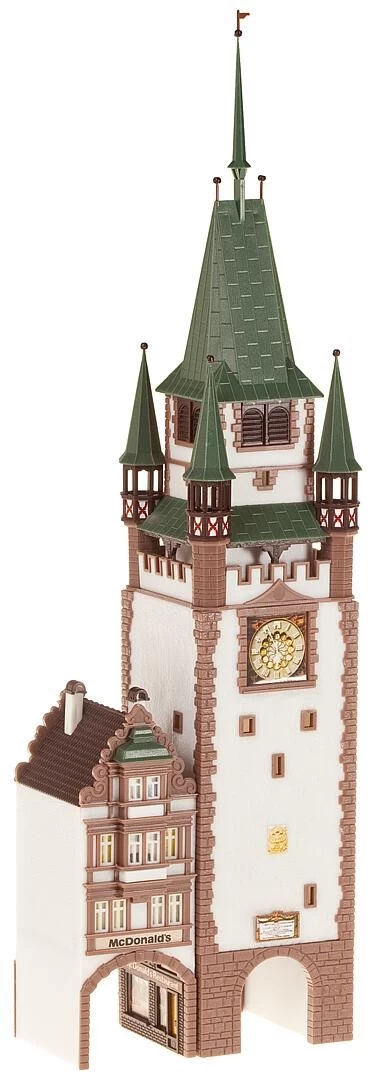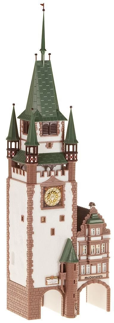 Das nebenstehende GeÂbäude kann auch getrennt vom Turm in einer StadthäuserÂzeile verwendet werden. Im Durchgang dieses Gebäudes lässt sich aus den BauÂsatzteilen die Eingangsfront eines modernen Schnellrestaurants gestalten. Das Zifferblatt der beiden Uhren kann vom Turm aus effektvoll beleuchtet werden.