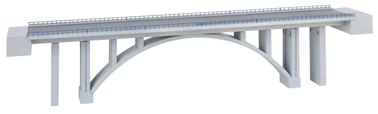 Faszination Brückenbau! Moderne, weitgespannte Betonbogenbrücke mit jeweils zwei anschließenden Brückenfeldern und Widerlagern in Anlehnung an die Thüringer Rehtalbrücke. 2-gleisig befahrbar und für alle Modellgleise verwendbar.