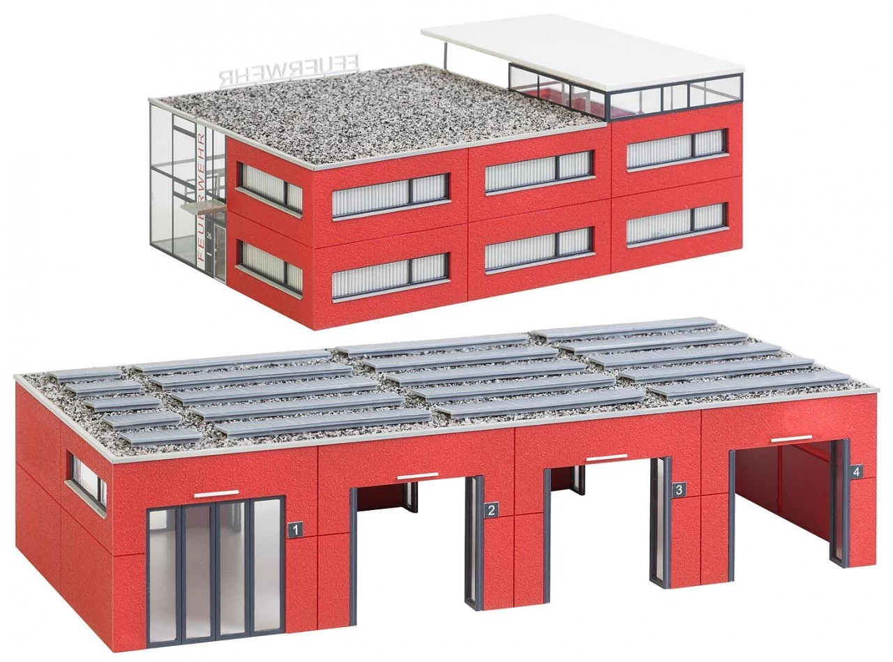 Feuer und Flamme! Signalrotes Feuerwehrhaus in Anlehnung an ein Originalvorbild in Oberndorf am Neckar, bestehend aus einem zweigeschossigen Kopfbau mit Verwaltungs- und Sozialräumen sowie einem angrenzenden Hallenbau mit vier Boxen für Feuerwehrfahrzeuge und für die Nutzung als Werkstatt oder Waschhalle. Markanter Verwaltungstrakt: im liegenden Quaderbau mit überdachter Terrasse und modernen Fensterbändern schafft die verglaste Gebäudeecke mit gefalteter Betontreppe am Eingang zur Leitstelle ein lebendiges Spiel von Licht und Schatten. Transparente Fahrzeughalle: am zweiten Flachdachbau, wo täglich die schweren Feuerwehrfahrzeuge ein- und ausrücken, fällt durch verglaste Falttore großzügig Tageslicht in die Hallen. Toröffnungen zur Vorder- und Rückseite ermöglichen den Einsatz von FALLER Car System. Alarmiert wegen Raummangel? Viel mehr Platz für Ihre Einsatzfahrzeuge bietet die als Ergänzung passende Fahrzeughalle, Art. 130161.