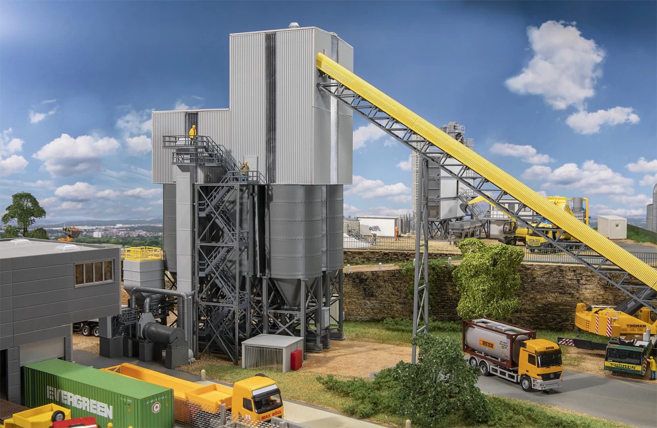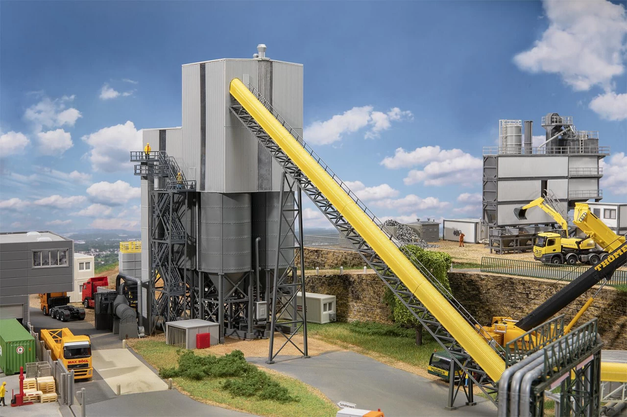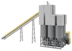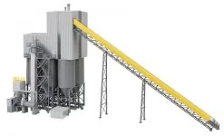 Großes Schotterwerk mit eingehauster Aufbereitungsanlage, sechs Speichersilos, Verladestraßen, einem Elevator, einem langen Förderband mit Abdeckhaube sowie verschiedenen Plattformen, Laufstegen und Treppen für die Arbeiter. Das Modell kann auch bei Tunnelbauprojekten zur Darstellung der Weiterverarbeitung des herausgebrochenen Gesteinsmaterials verwendet werden. Modell ohne Funktion.