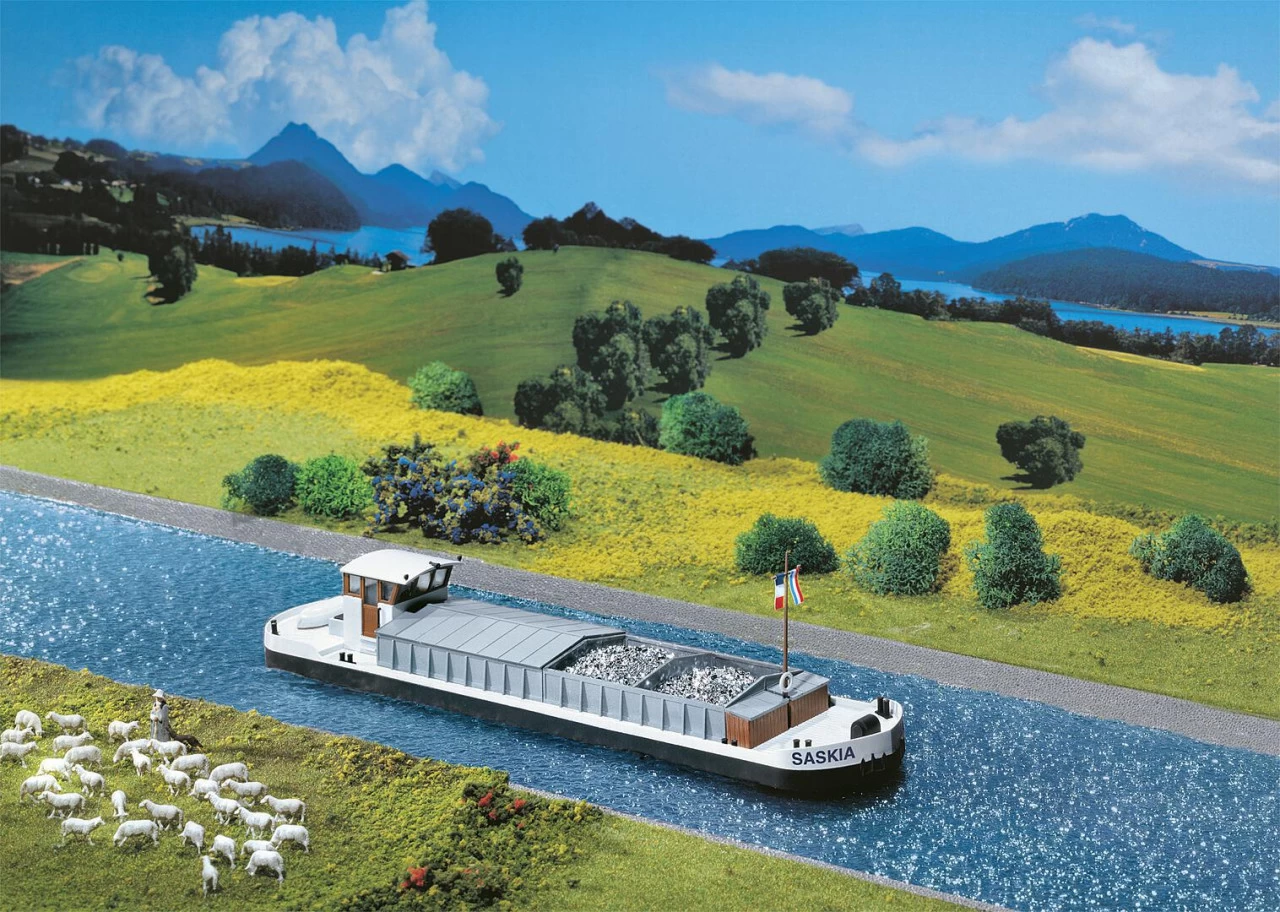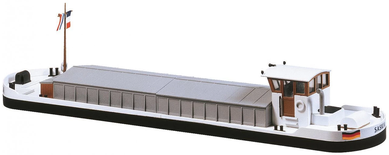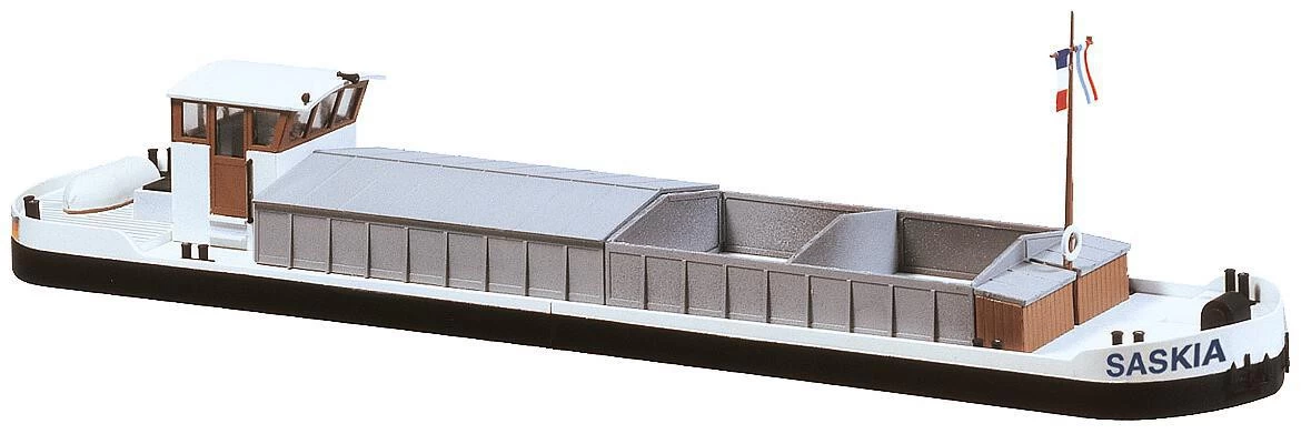 Für die Binnen-Schifffahrt auf den Modellanlagen. Abgedeckte Ladeluken und Steuerhaus. Abgeflachter Rumpf. Nicht schwimmfähig.