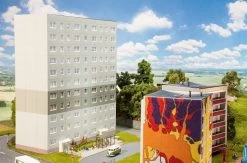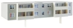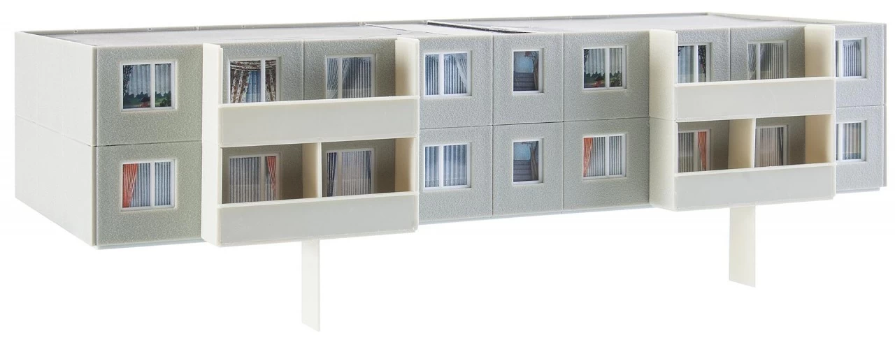 Industrieller Wohnungsbau im Baukastensystem. Set mit zwei ergänzenden Stockwerken (Wandplatten und Balkone, Fenster, Deko-Maske) des Plattenbautypus P2, passend zum Artikel »Plattenbau P2 Basispackung« (Art. 130801). Bitte beachten Sie, dass ein Gebäudesockel und ein Dach nicht zum Bausatzumfang gehören.
